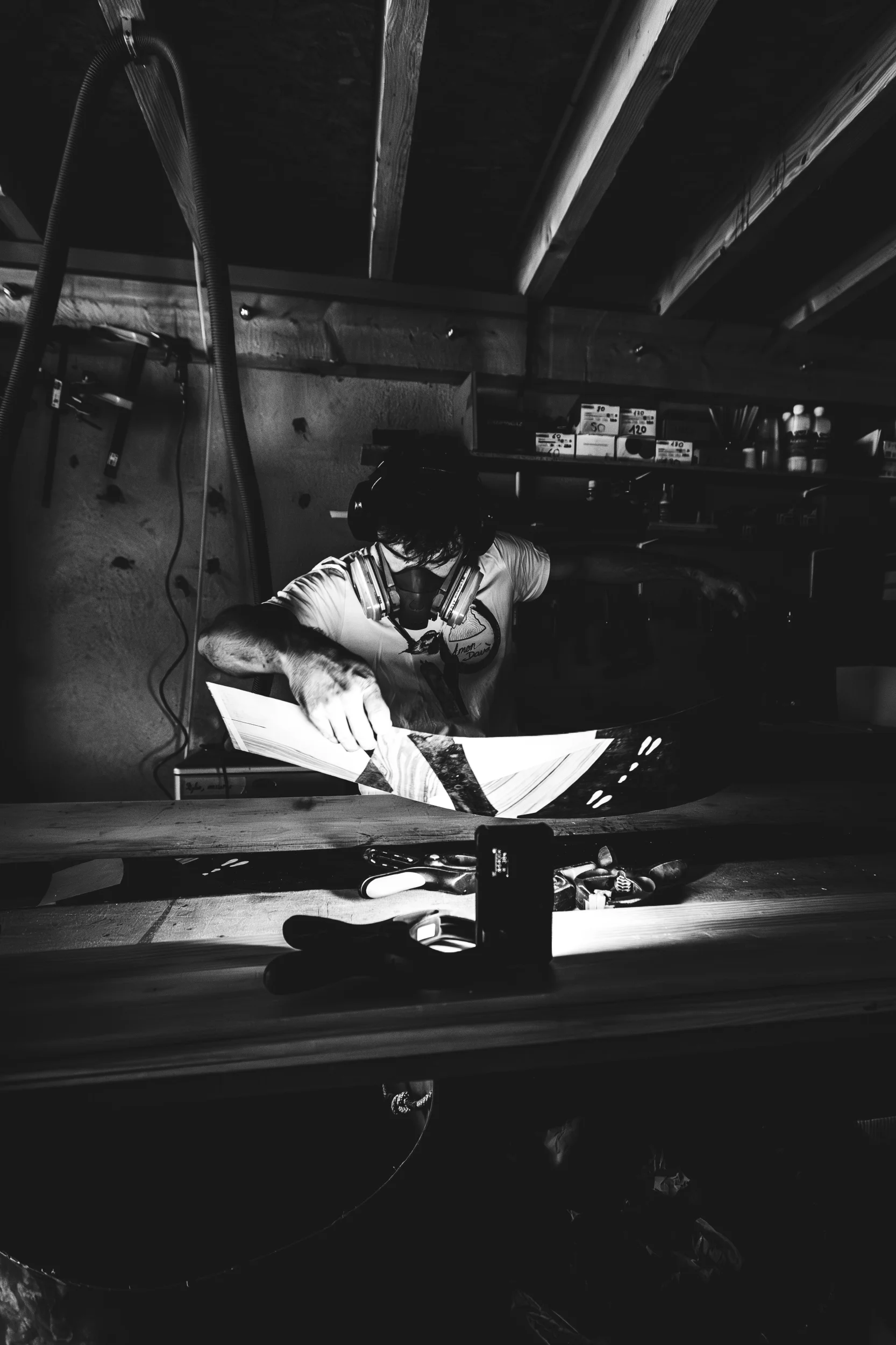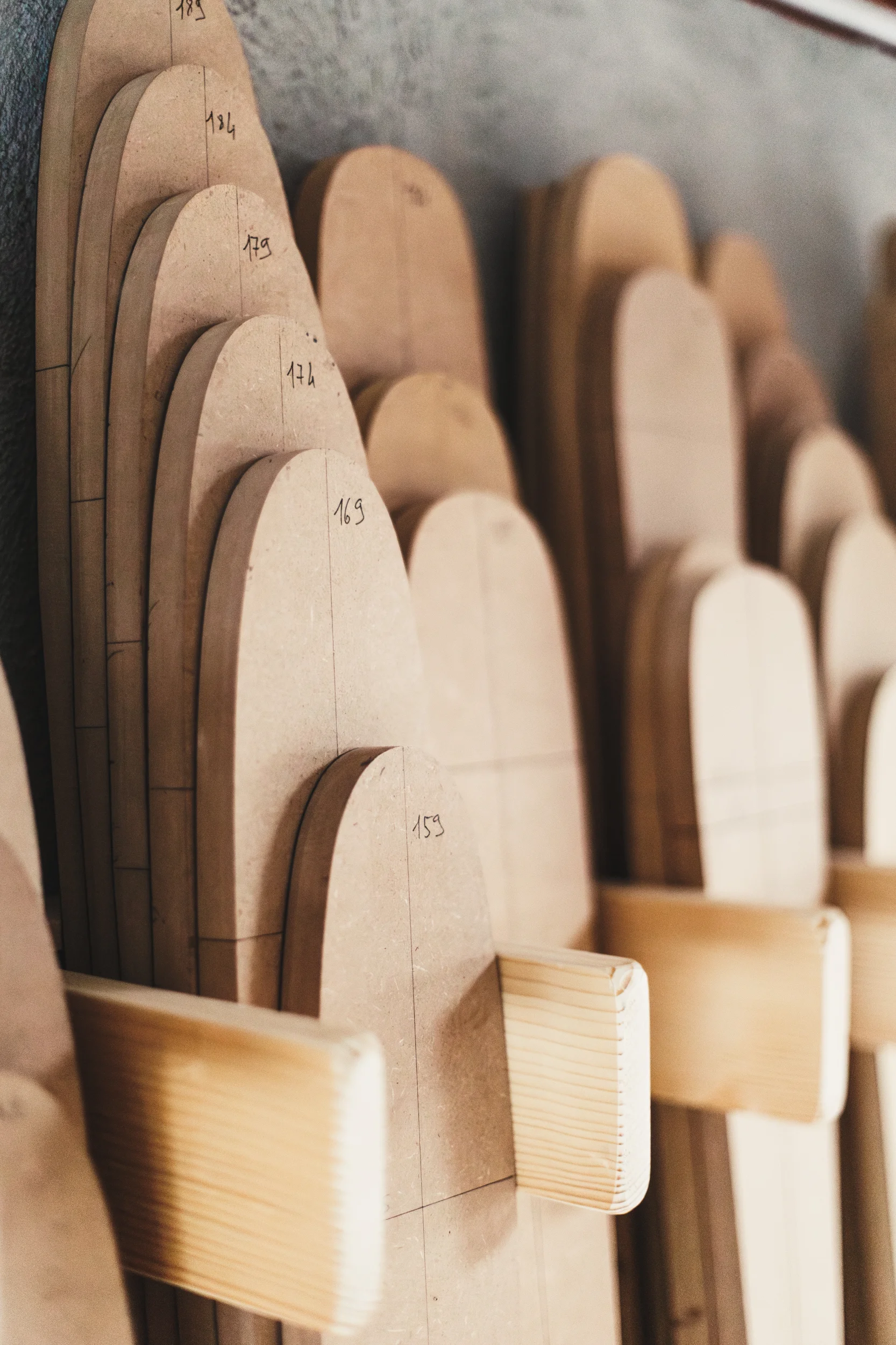 Damien : Disons que je suis plutôt autour de trente aujourd’hui, et quarante serait un bon rythme. Ce n’est pas un plafond, c’est une question d’équilibre. Si la demande augmente, je peux déléguer certaines étapes, comme la préparation des semelles (mise à plat, structure, fartage et affutage). Ce sont des tâches que je peux confier à un atelier partenaire. Et si ça continue à croître, il y a toujours des solutions : sous-traiter des éléments, embaucher, ou confier le design à quelqu’un d’autre.