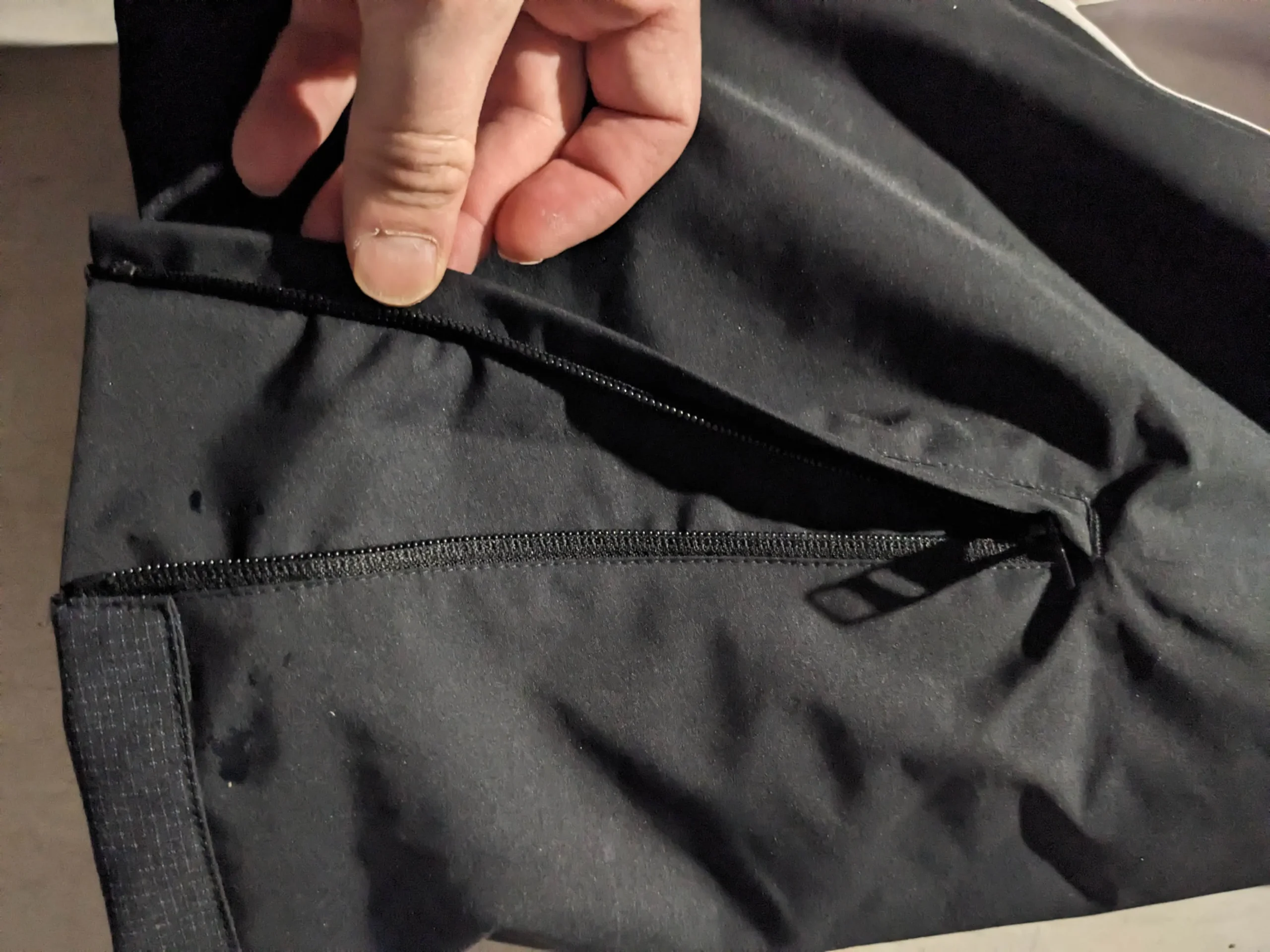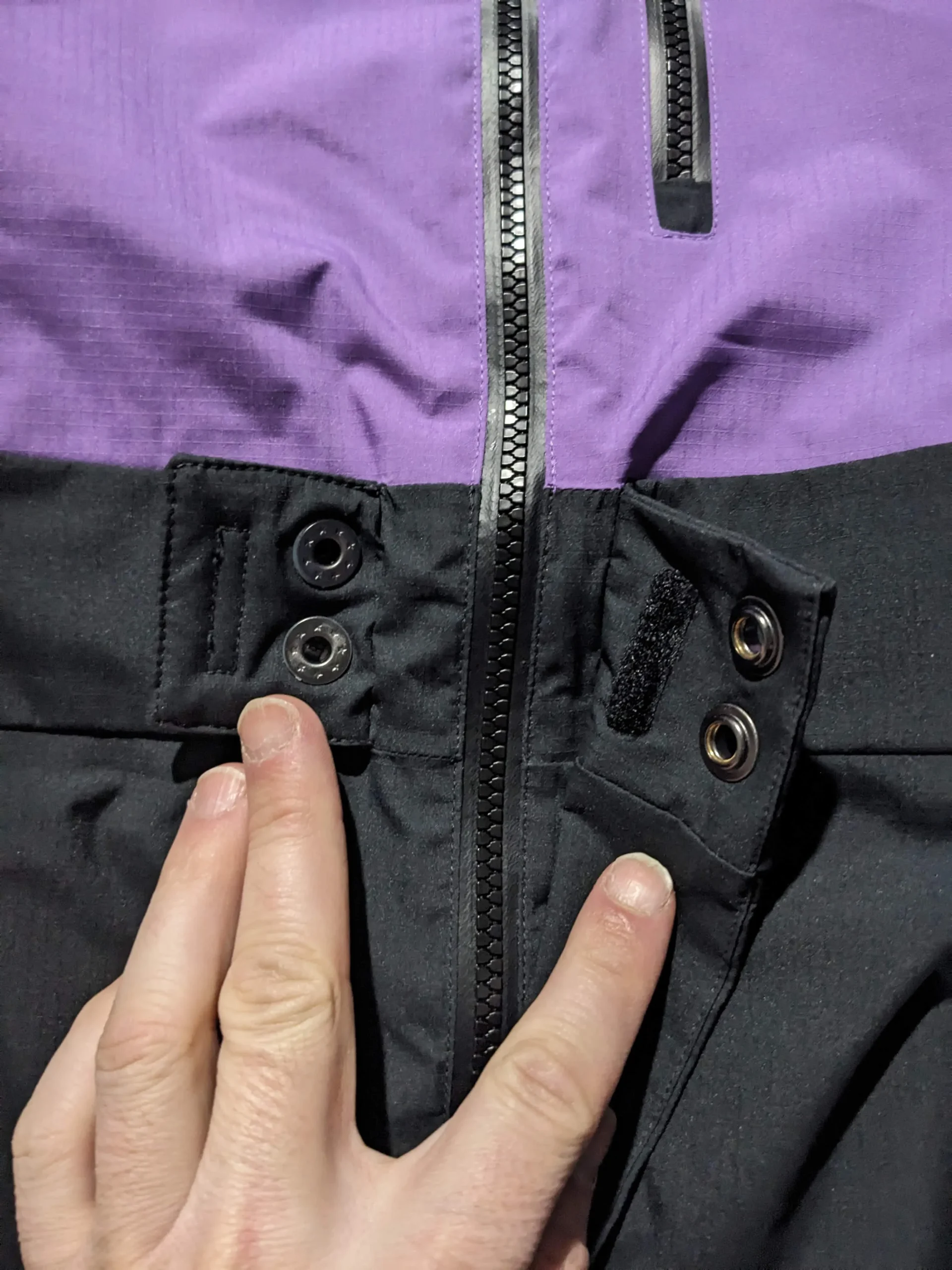 En bas du pantalon de ski, on trouve un zip latéral vertical qui permet d’ajuster la largeur des pantalons au niveau de la chaussure. Probablement intéressant lorsqu’on porte des chaussures particulièrement volumineuses. Mais de mon point de vue et avec mon utilisation type, cette fermeture n’amène rien, en plus elle n’est pas étanche, même si au niveau des chaussures ce n’est absolument pas dramatique.