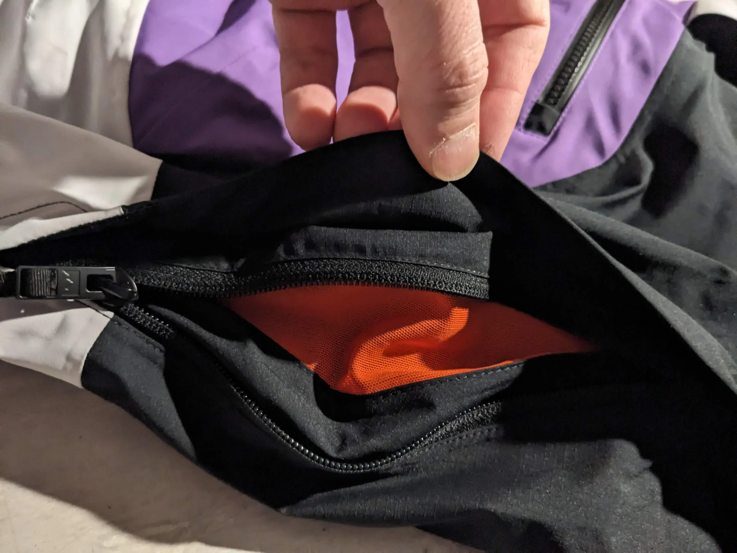 Probablement utile par températures élevées, les fermetures éclair ne semblent pas étanches, mais sont protégées derrière un rabat qui protège des intempéries. Elles sont en tout cas bien placées pour créer une bonne circulation de l’air. Mais au milieu de l’hiver, vous n’en aurez pas besoin, à moins qu’il fasse 10 degrés en janvier… Ça peut arriver.