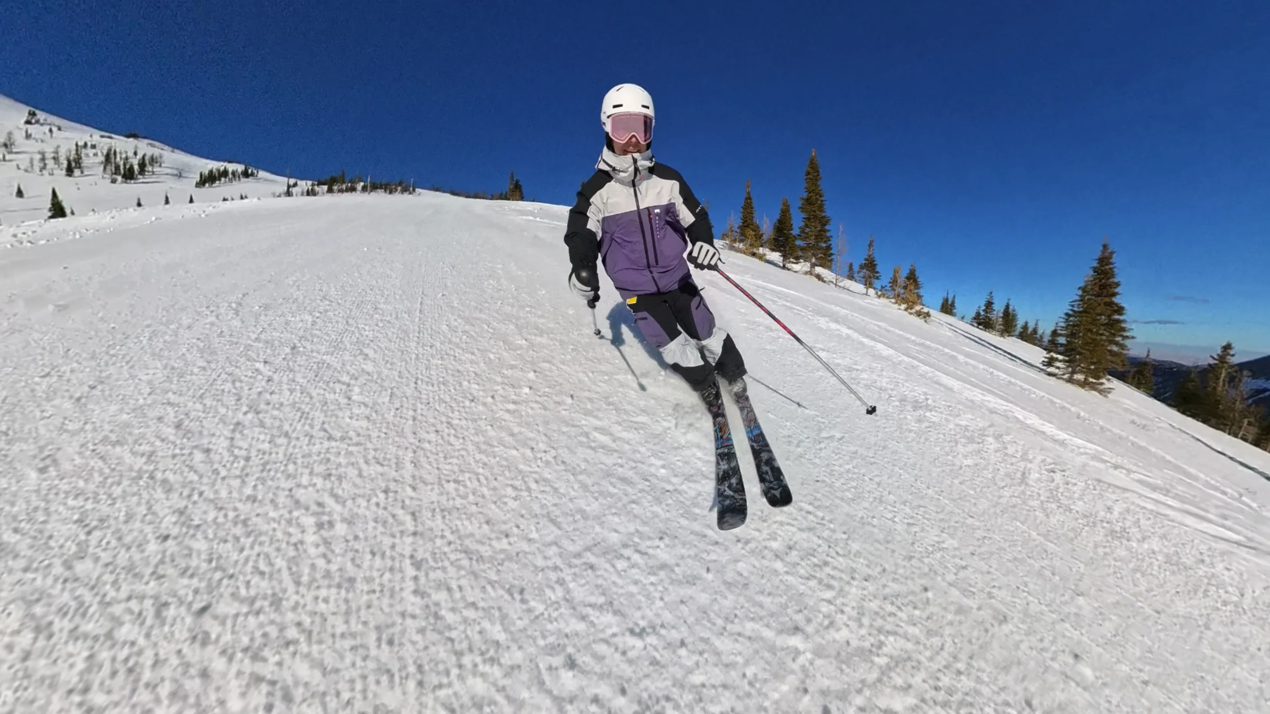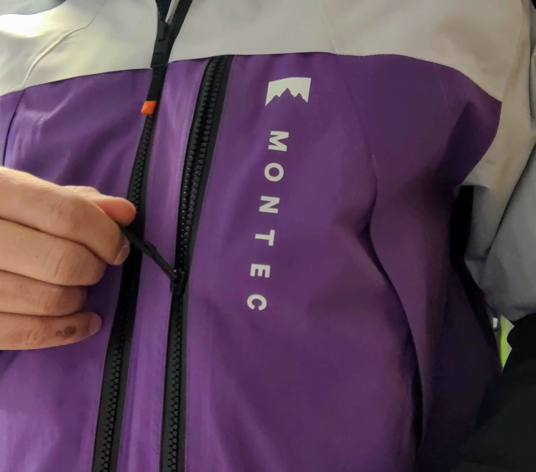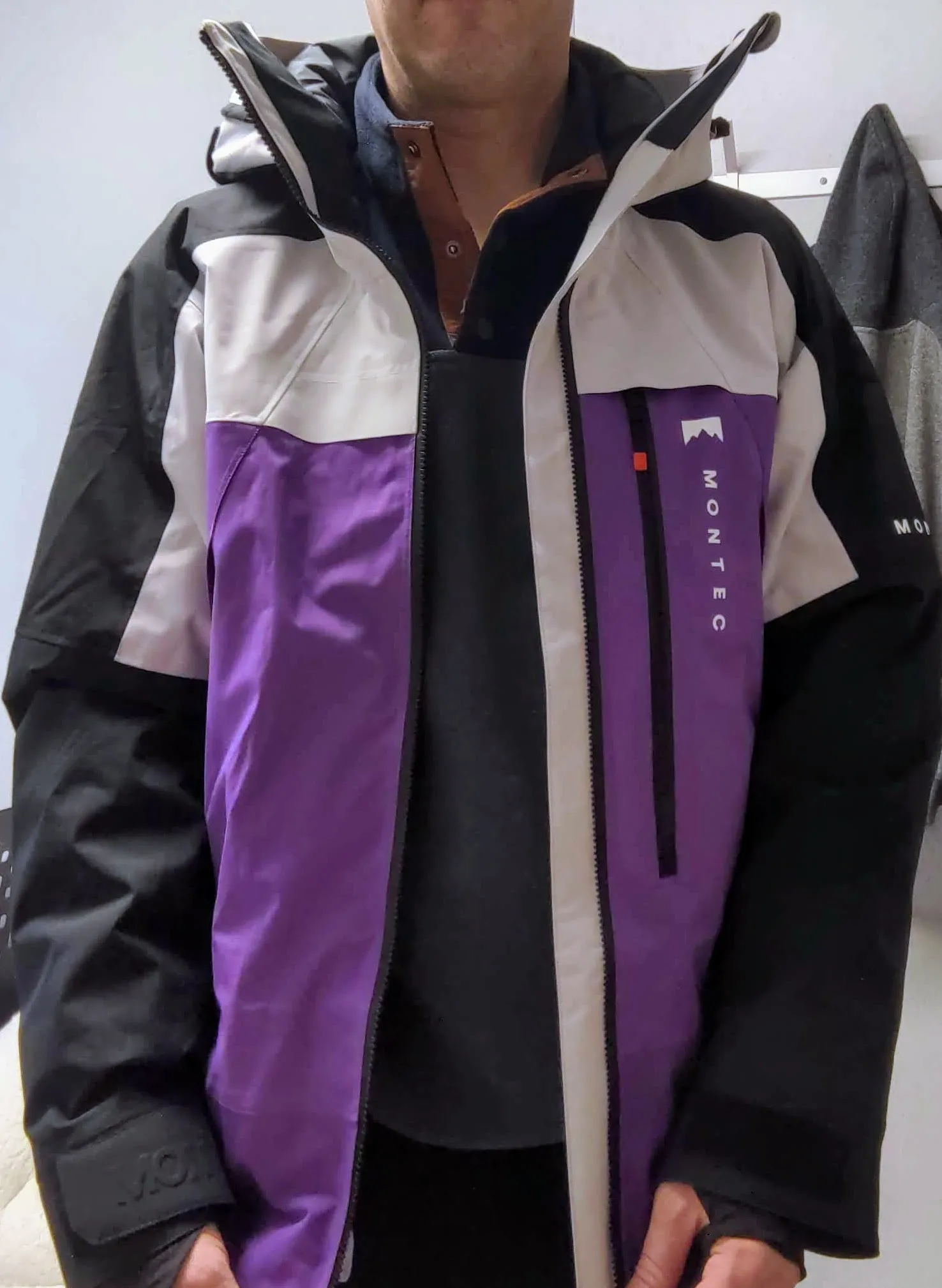 Les autres coloris sont beaucoup plus neutres, et je trouve ça un peu triste personnellement. Mais, comme je l’ai dit, les goûts et les couleurs… ça se discute ? Je ne sais pas. En tout cas, je suis un peu nostalgique du temps où les couleurs sur les pistes étaient présentes. En commandant ce coloris, j’avais peur que ce soit un peu trop criard, mais en réalité ce n’est pas flashy du tout, le violet avec quelques petites pointes d’orange sur les fermetures éclair ou sur les doublures intérieures égaient l’apparence du skieur dans son ensemble. Le noir et le « gris clair » (comme Montec l’appelle) viennent casser et équilibrer les couleurs.
