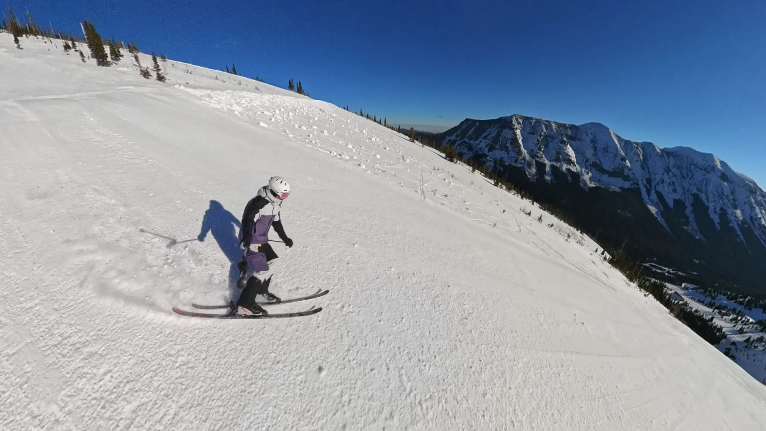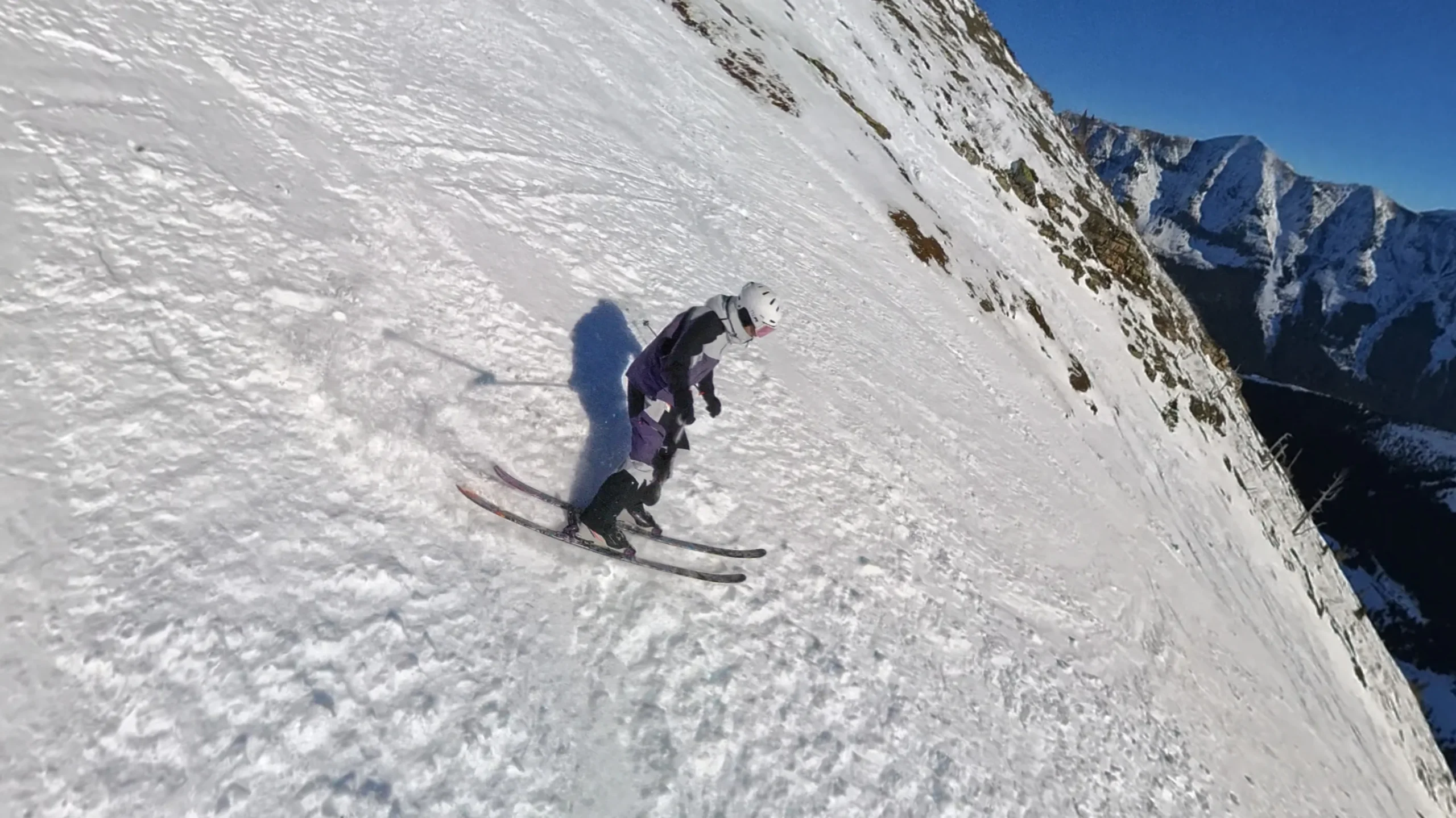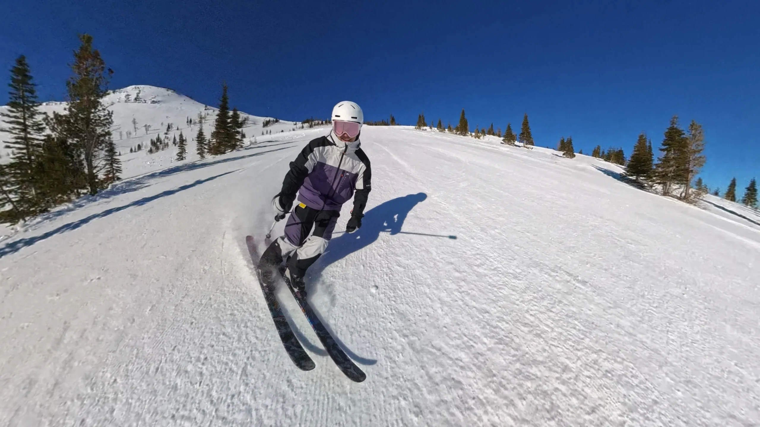 Les autres coloris sont beaucoup plus neutres, et je trouve ça un peu triste personnellement. Mais, comme je l’ai dit, les goûts et les couleurs… ça se discute ? Je ne sais pas. En tout cas, je suis un peu nostalgique du temps où les couleurs sur les pistes étaient présentes. En commandant ce coloris, j’avais peur que ce soit un peu trop criard, mais en réalité ce n’est pas flashy du tout, le violet avec quelques petites pointes d’orange sur les fermetures éclair ou sur les doublures intérieures égaient l’apparence du skieur dans son ensemble. Le noir et le « gris clair » (comme Montec l’appelle) viennent casser et équilibrer les couleurs.