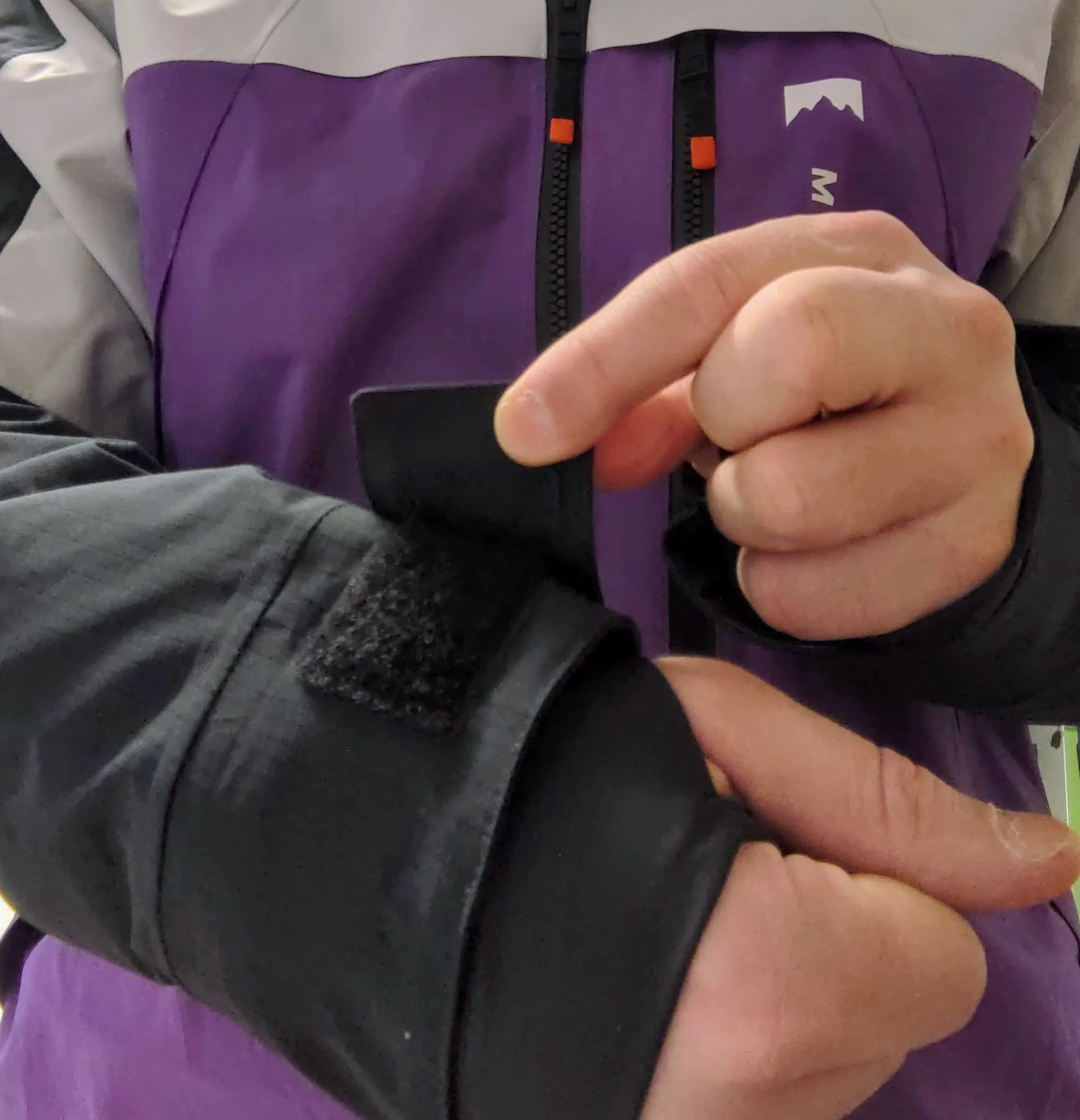 Au niveau des bras, les scratchs d’ajustement sont bien placés et résistants. Ils permettent un bon ajustement autour des gants. Une membrane vient compléter l’isolation, au niveau des poignets. Il suffit de passer son pouce dans le trou prévu et hop, plus d’air, on est bien isolé au niveau des bras.